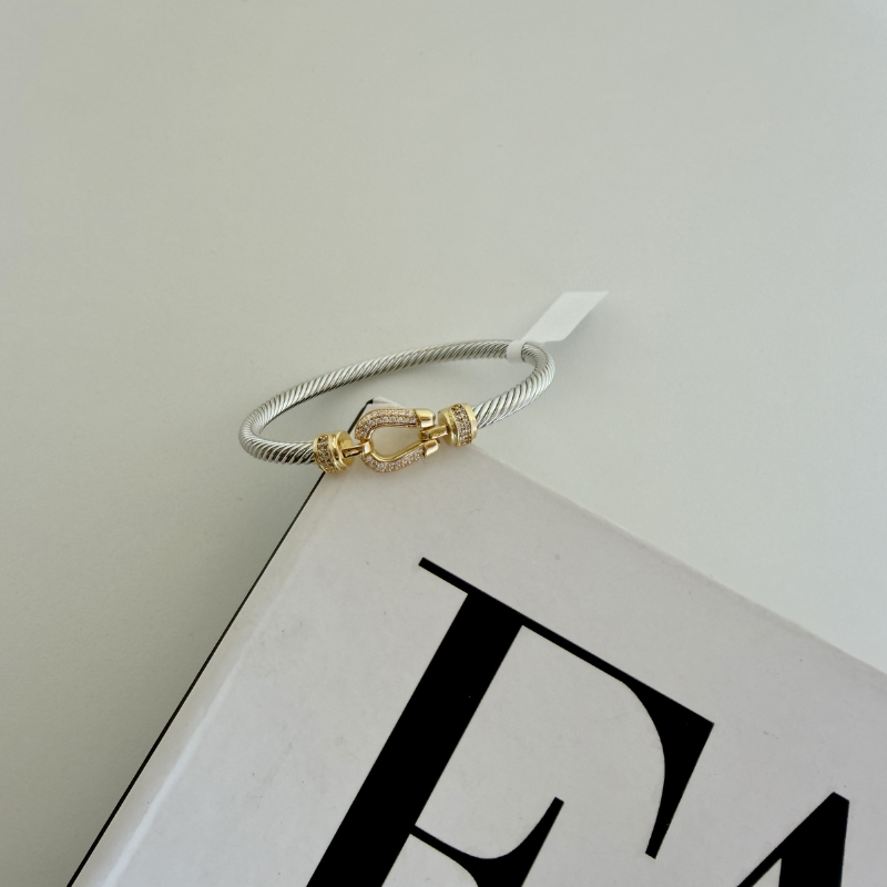 A uniquely designed horseshoe bracelet in silver color made of stainless steel available in size 16 with a 5.5 cm diameter suitable for small and medium wrist sizes