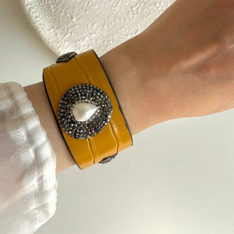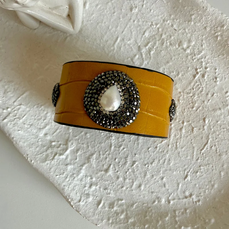 A leather bracelet with a distinctive design adorned with a pearl stone suitable for everyday wear and special occasions